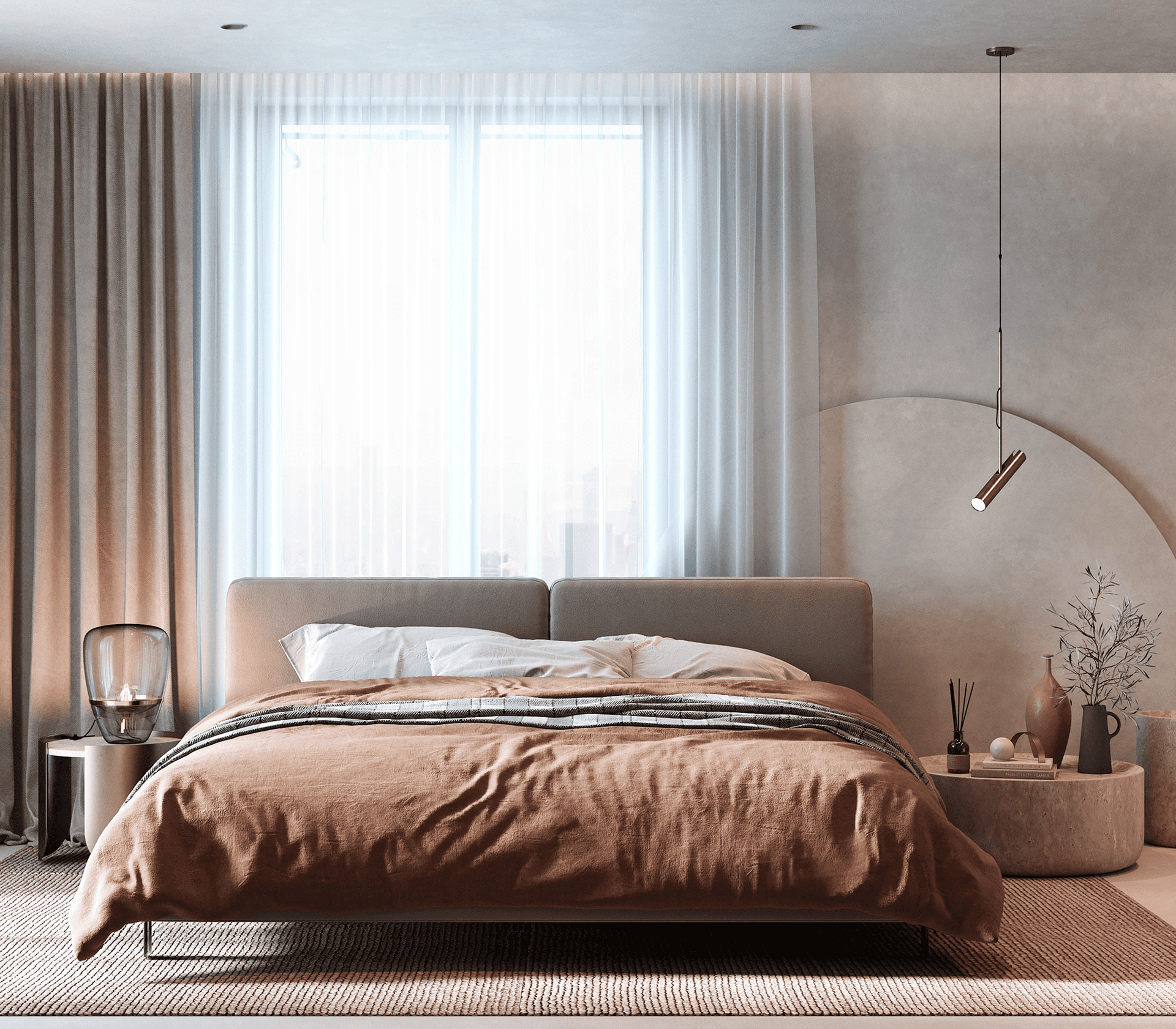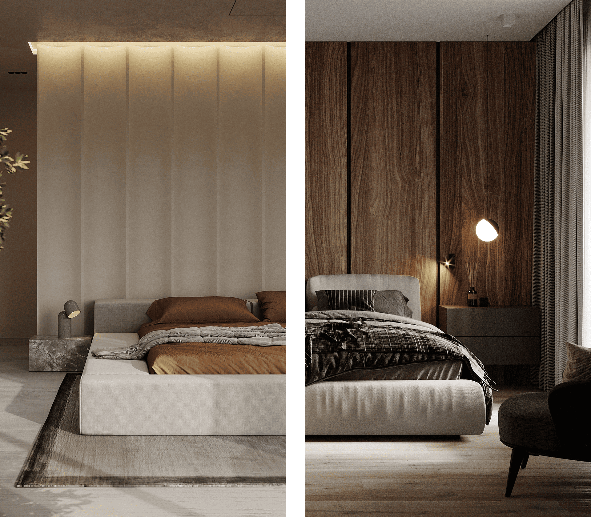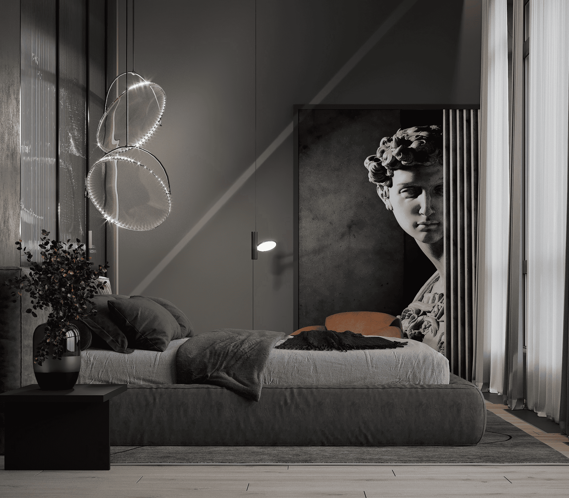 В минималистичной спальне, где царит лаконичность и отсутствуют лишние детали, стена за изголовьем кровати зачастую оказывается точкой притяжения взгляда. Так интерьер обретает художественную завершенность, при этом не перегружает мозг перед сном, так как акцент остается вне поля зрения.