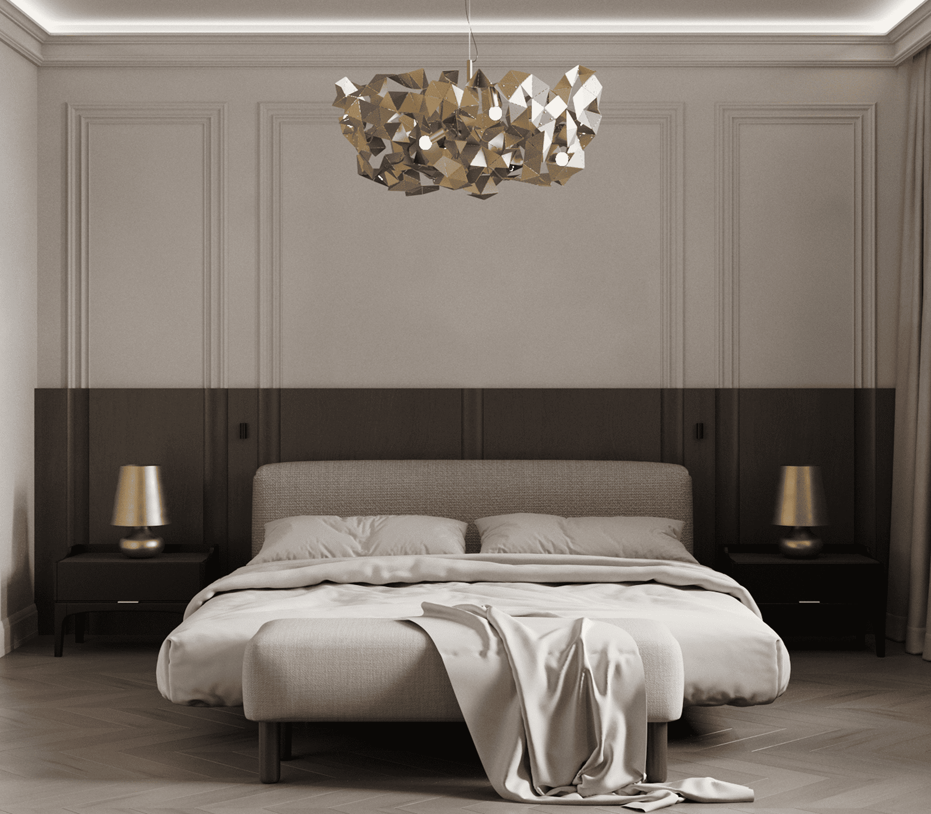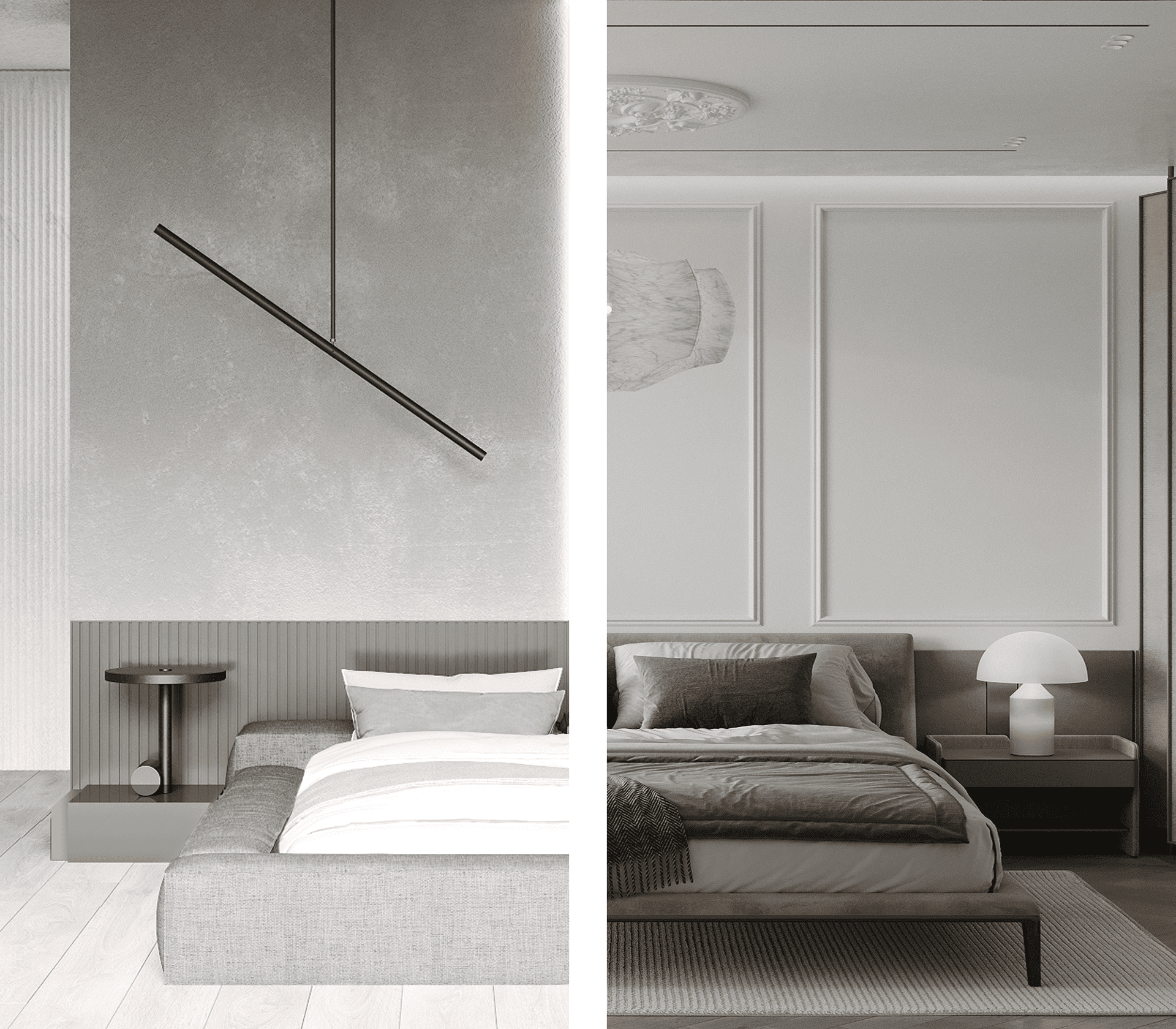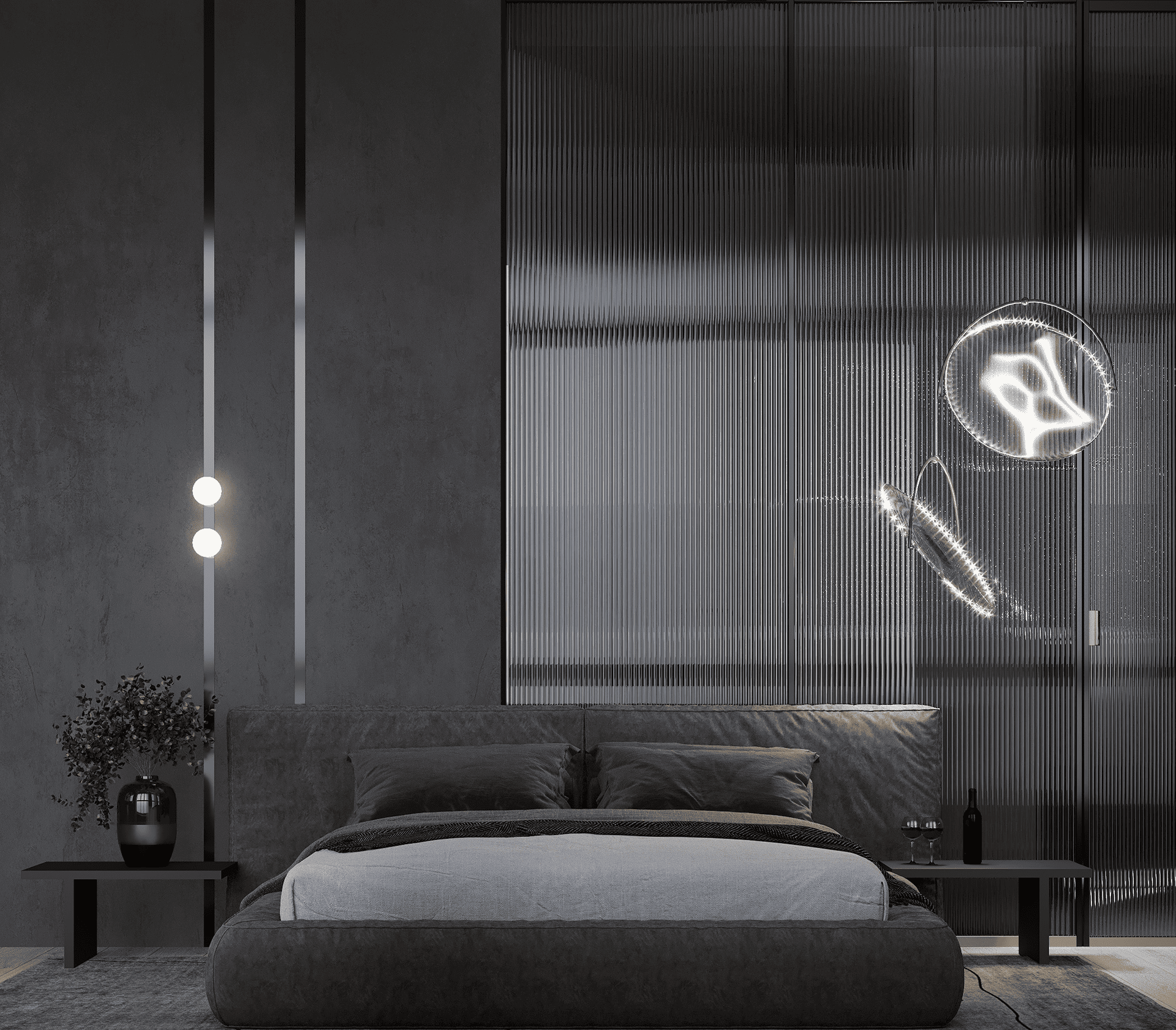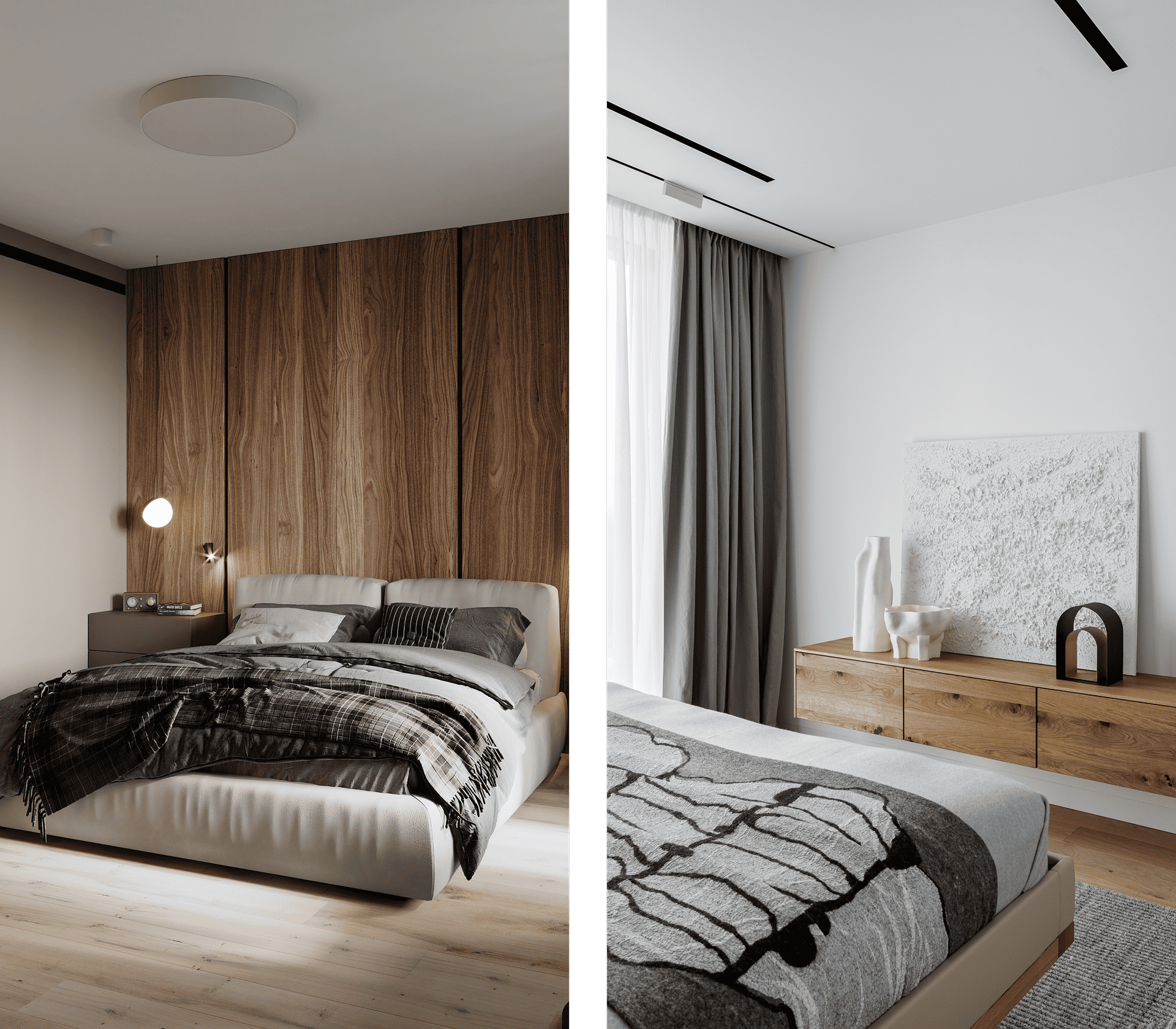 В минималистичной спальне, где царит лаконичность и отсутствуют лишние детали, стена за изголовьем кровати зачастую оказывается точкой притяжения взгляда. Так интерьер обретает художественную завершенность, при этом не перегружает мозг перед сном, так как акцент остается вне поля зрения.