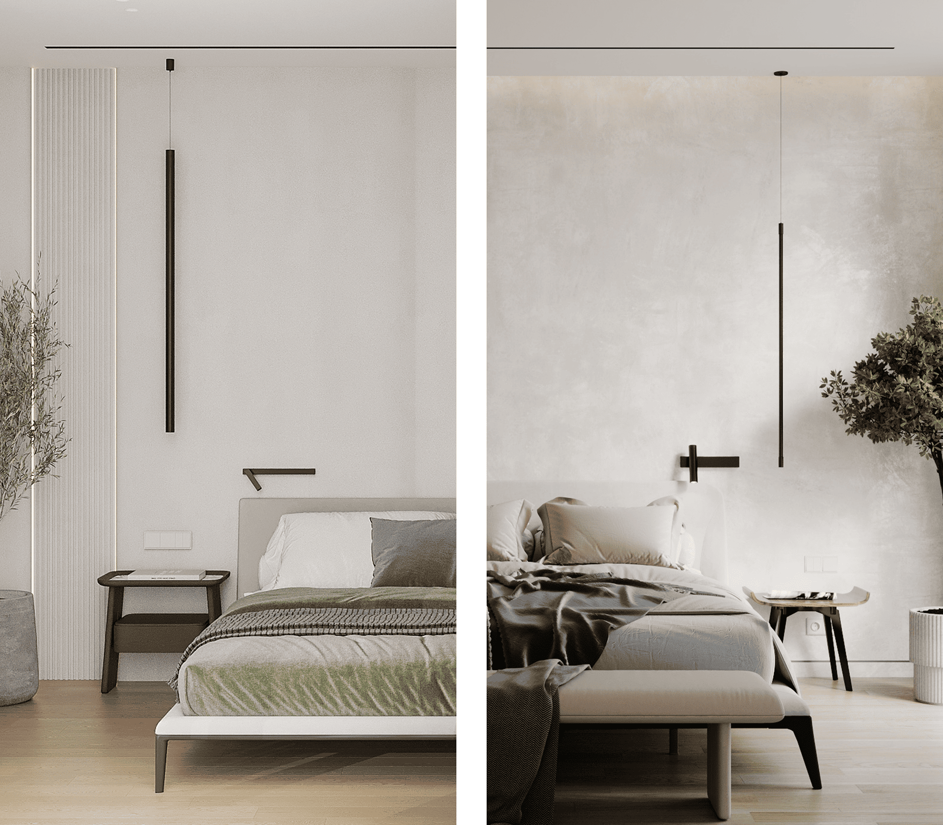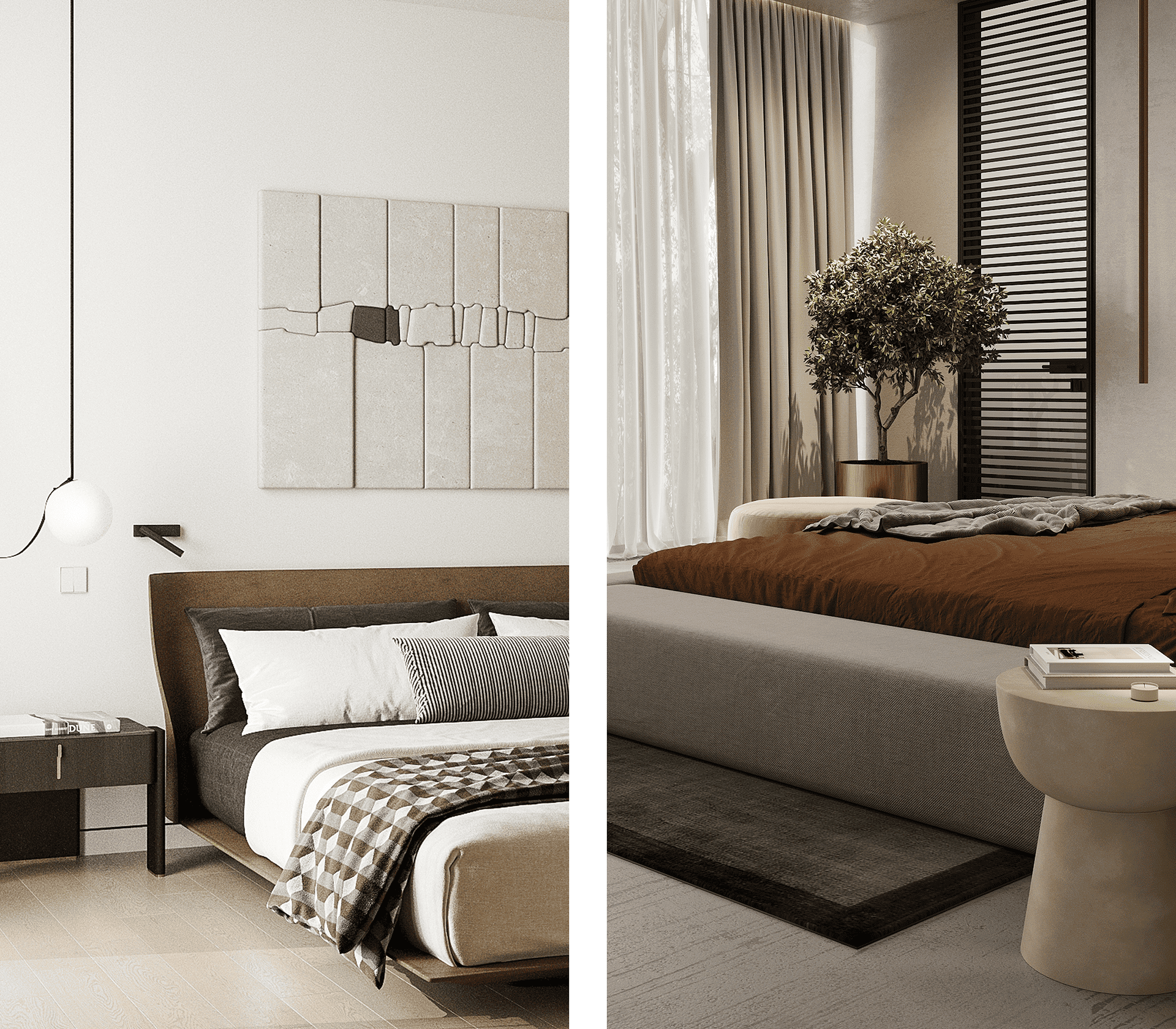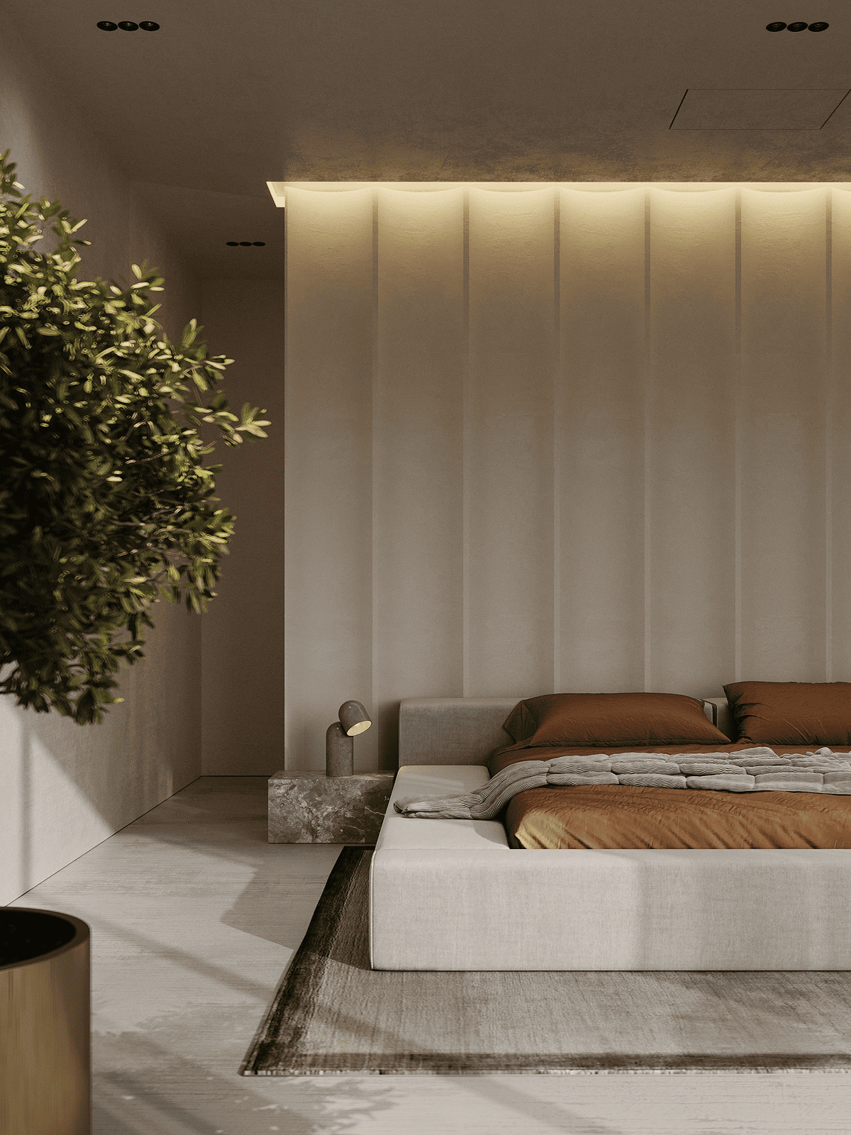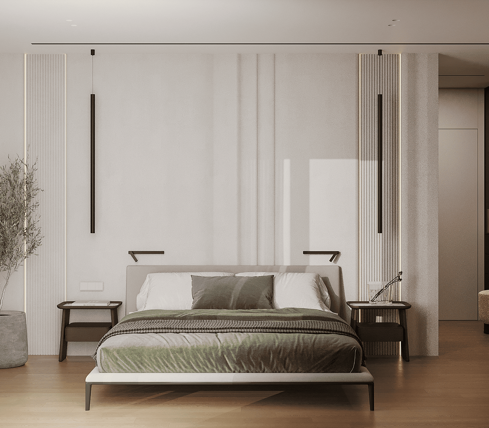 Дизайн спальни в современном стиле минимализм от студии P. S. Interior — это пространство, где каждая деталь, от выбора матраса до фактуры стен, продумана для того, чтобы вы просыпались отдохнувшими и вдохновленными. Это инвестиция в качество жизни.