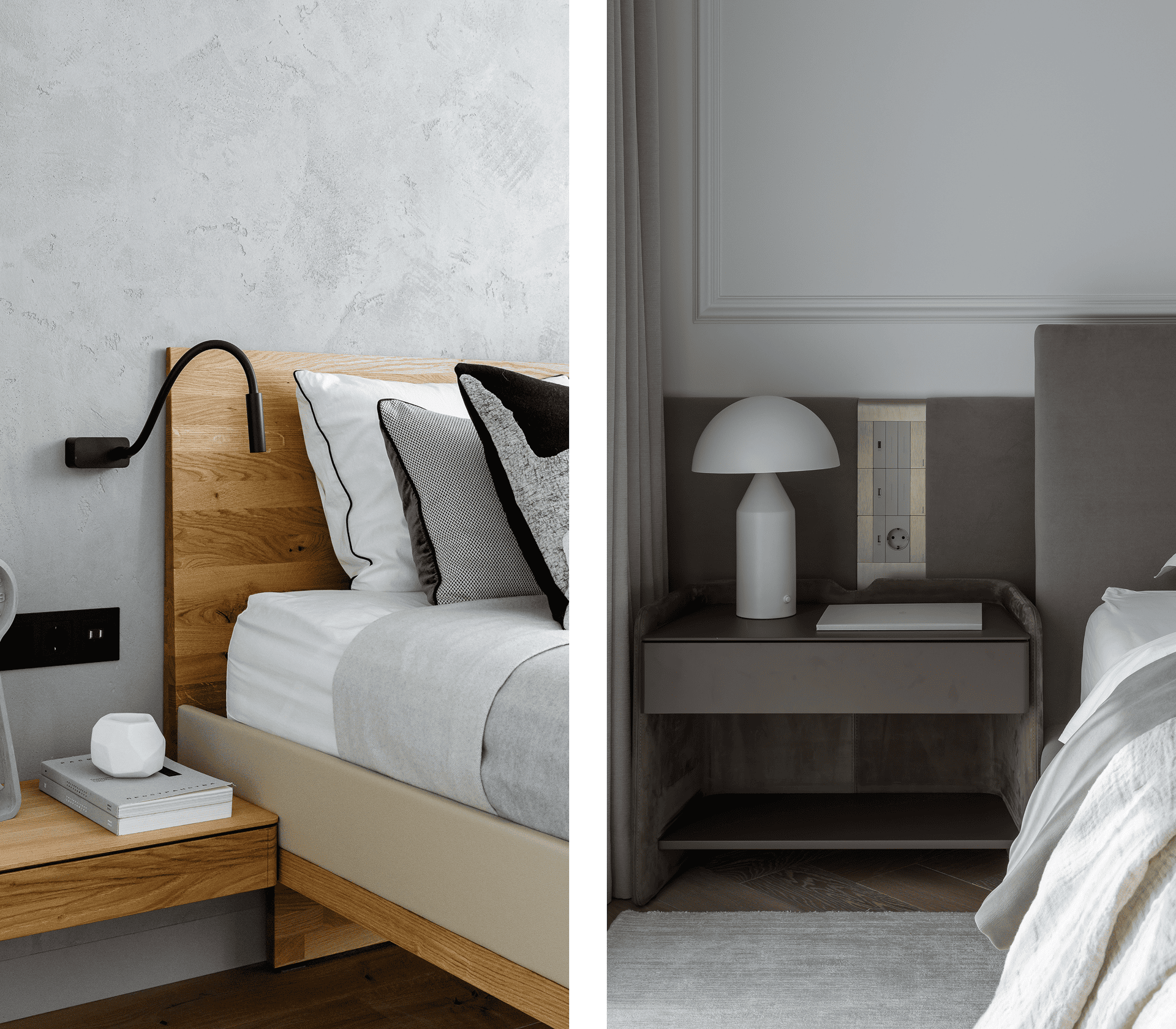 - Продуманный блок розеток. В зоне у кровати мы монтируем блок с обычными розетками и разъемами USB для одновременной зарядки всех гаджетов. Это решение избавляет от дополнительные адаптеров и проводов и сохраняет чистоту линий.