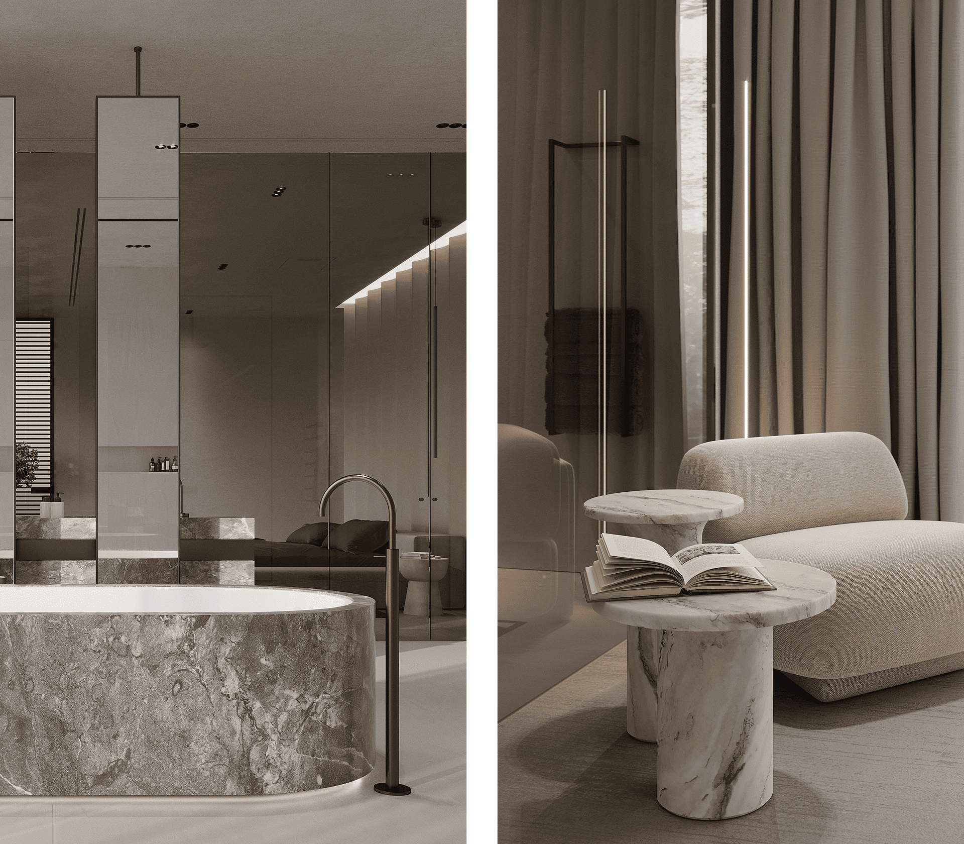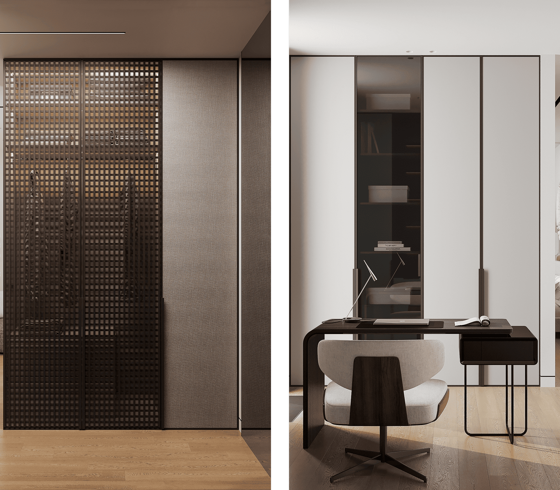 Например, в нашем дизайн-проекте «Резиденция Рублево» мы реализовали именно такую идею, создав максимально приватное и удобное пространство для заказчика.