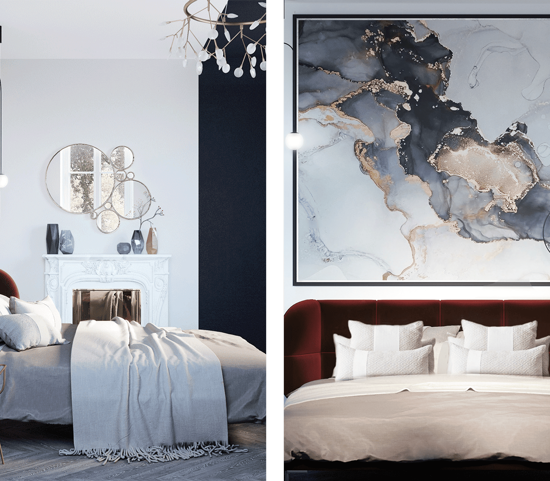 Декор в минималистичной спальне должен быть тщательно выверен. Мы чаще всего используем объемные монохромные картины, эстетичные растения или зеркала.
