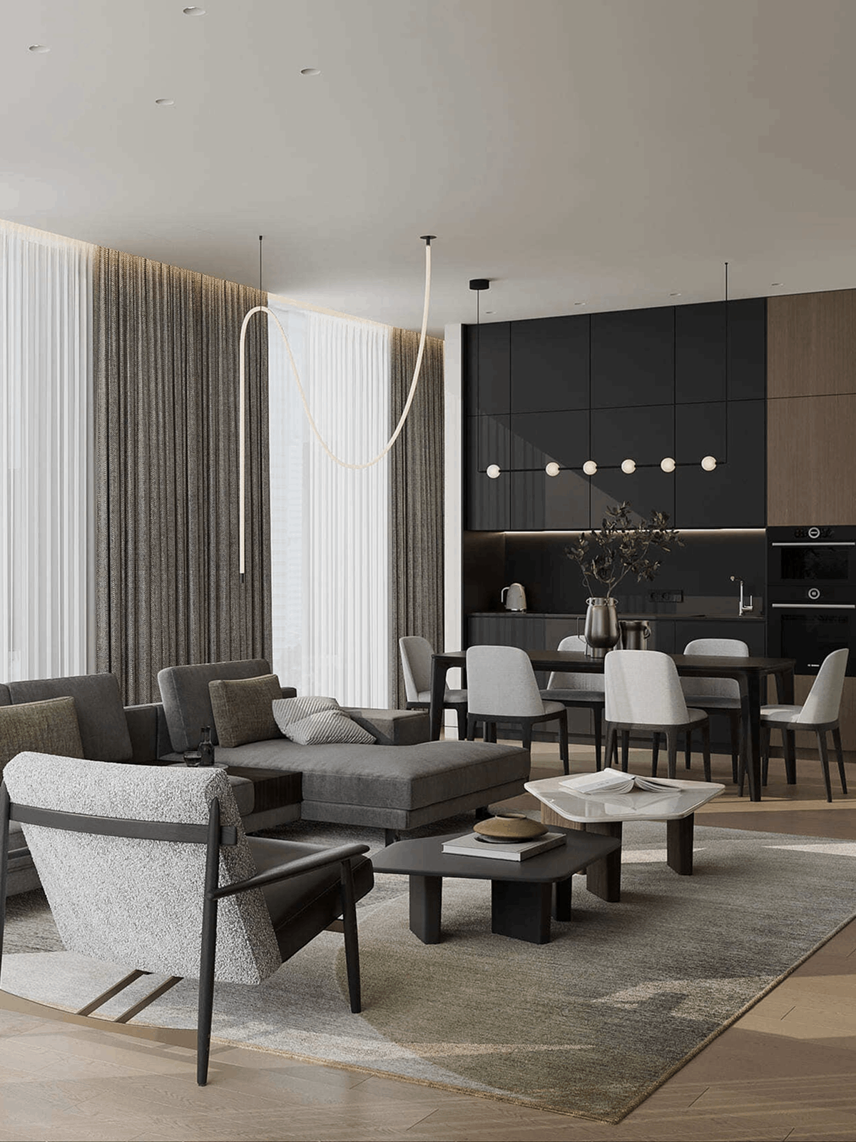 В том же проекте мы доработали границу за счет светильников — черные и лаконичные в кухонной зоне, белые и объемные — над обеденным столом и мягкой зоной.
