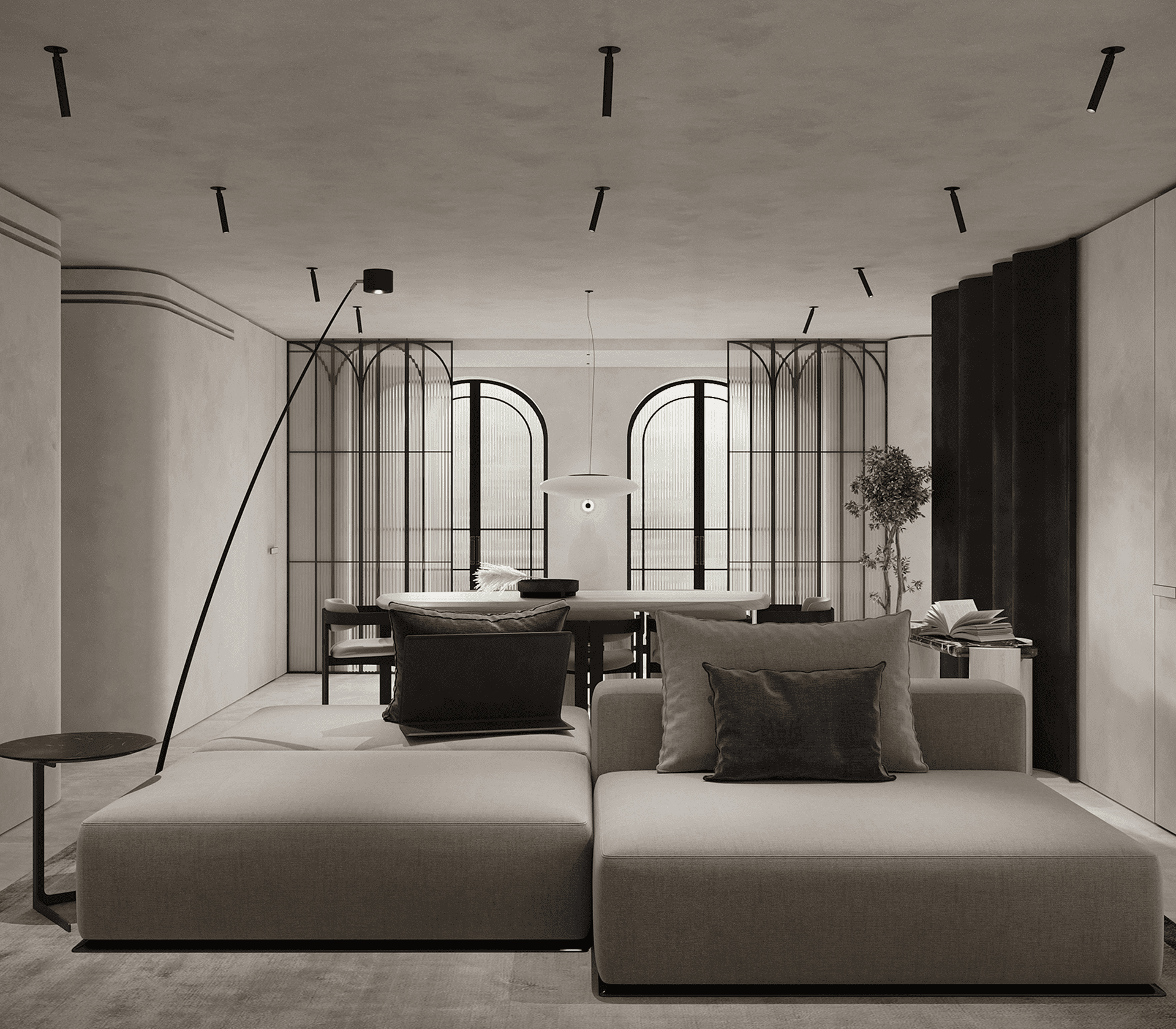 Акцентное освещение — это элегантный способ зонирования без перегородок. Крупная люстра над обеденной группой и точечная подсветка в гостиной создают гармоничное разделение пространства на зоны.