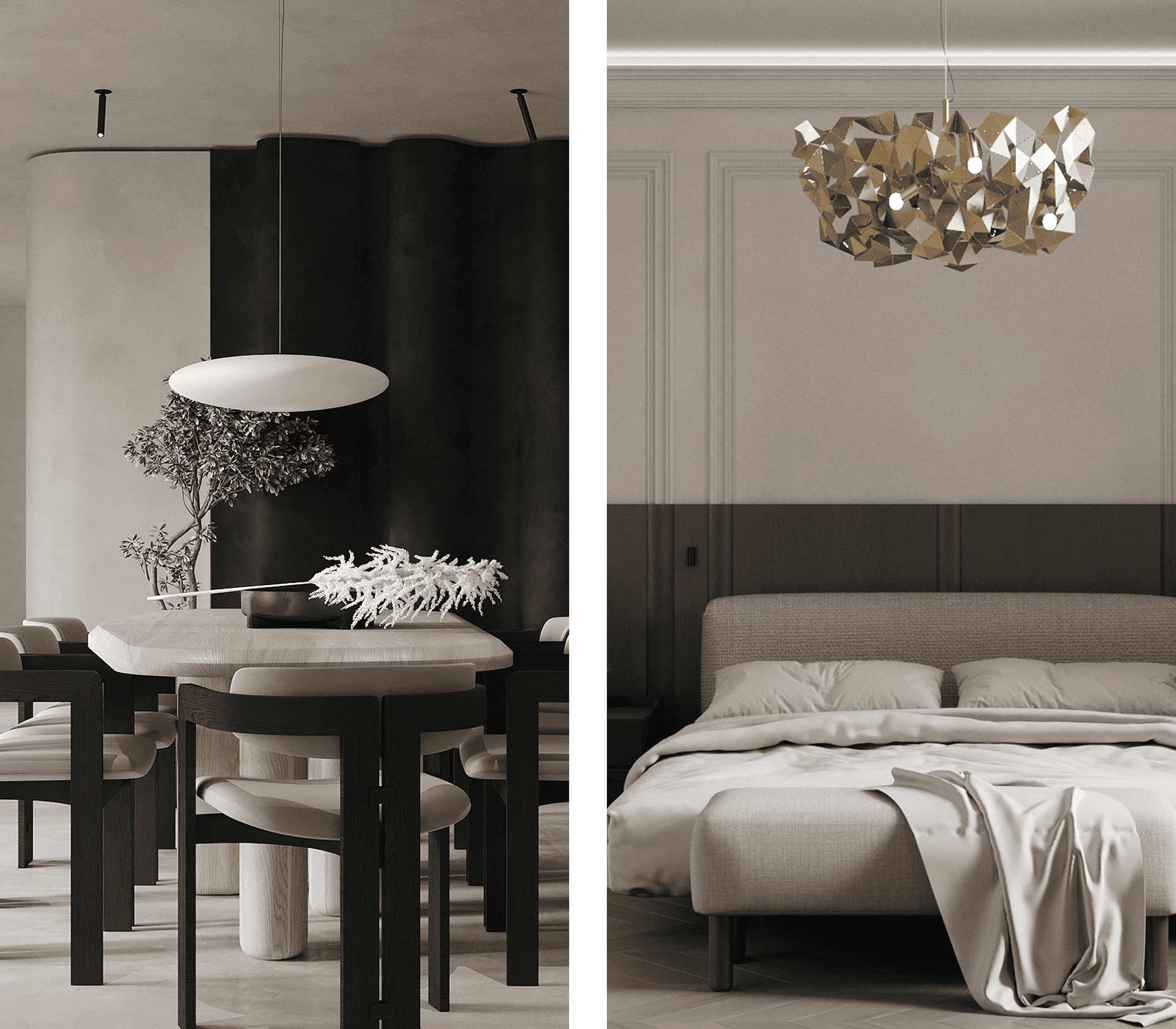 1. Декоративный светильник как визуальная доминанта. Он становится центром композиции в интерьере. Например, акцентная люстра в сочетании с точечными светильниками.