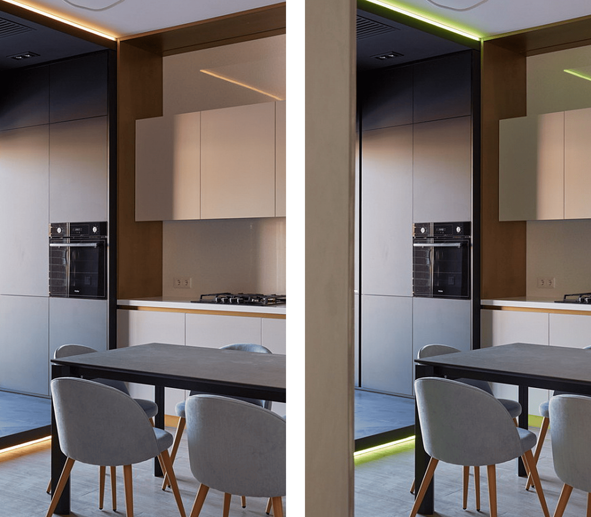 Звучит удобно, но по опыту мы ставим их не так часто. Они оправданы, когда заказчик не определился с предпочтениями или хочет экспериментировать с атмосферой. Но если человек точно знает, что ему комфортно, проще сразу подобрать правильные лампы и несколько световых сценариев.