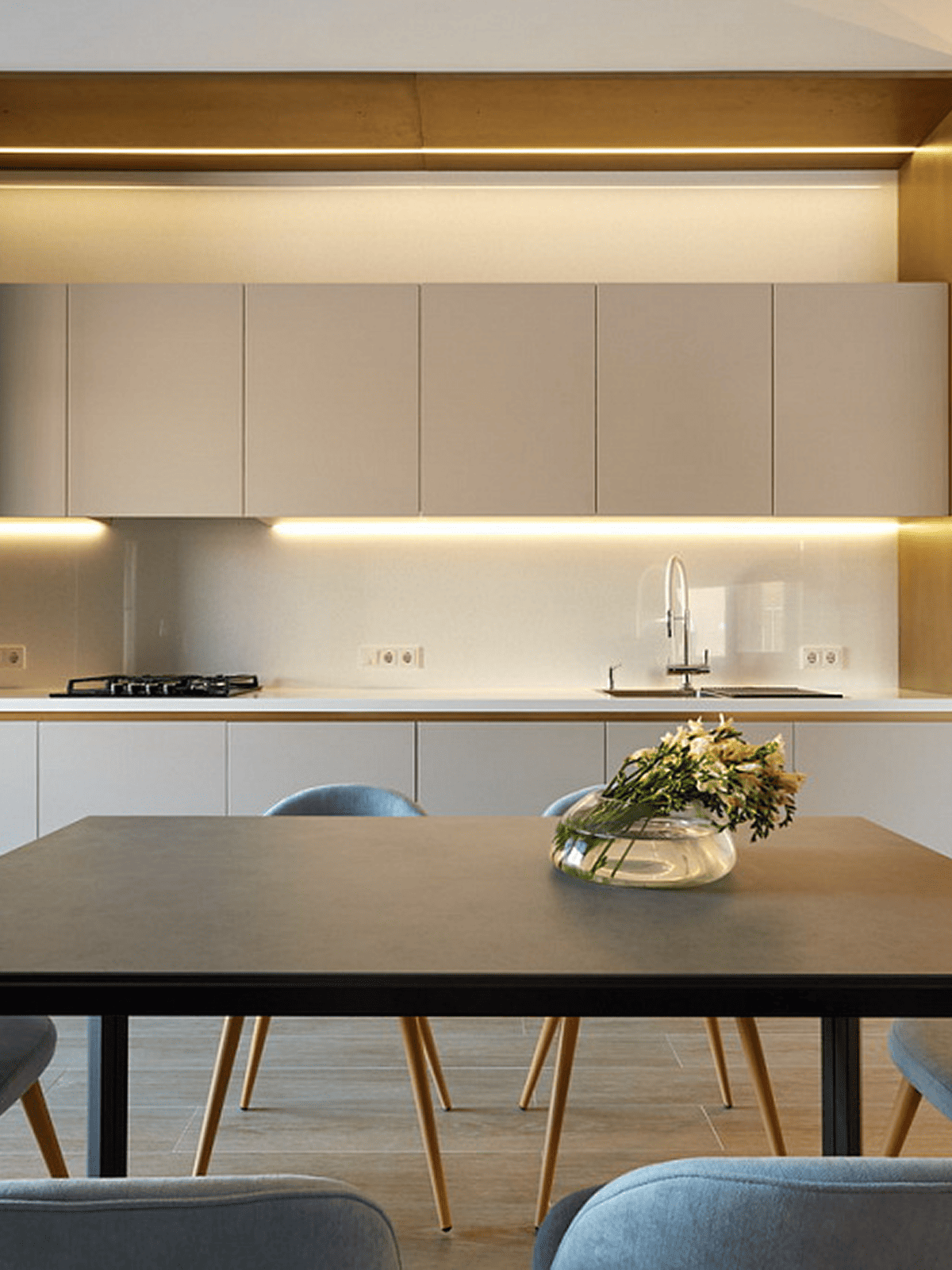 В шкафах подсветка становится функциональной: мы делаем ее на датчике открывания дверцы, а если фасады прозрачные — добавляем кнопку, чтобы включать свет при закрытых дверцах.