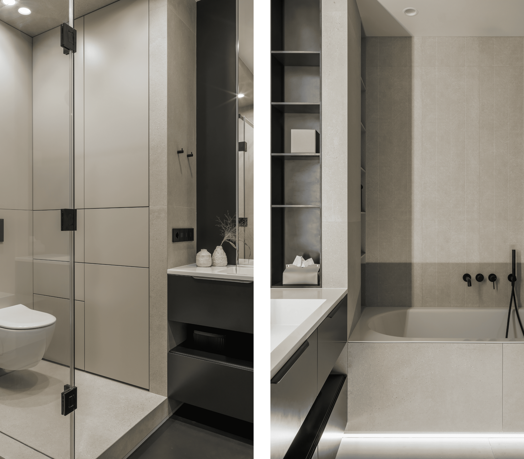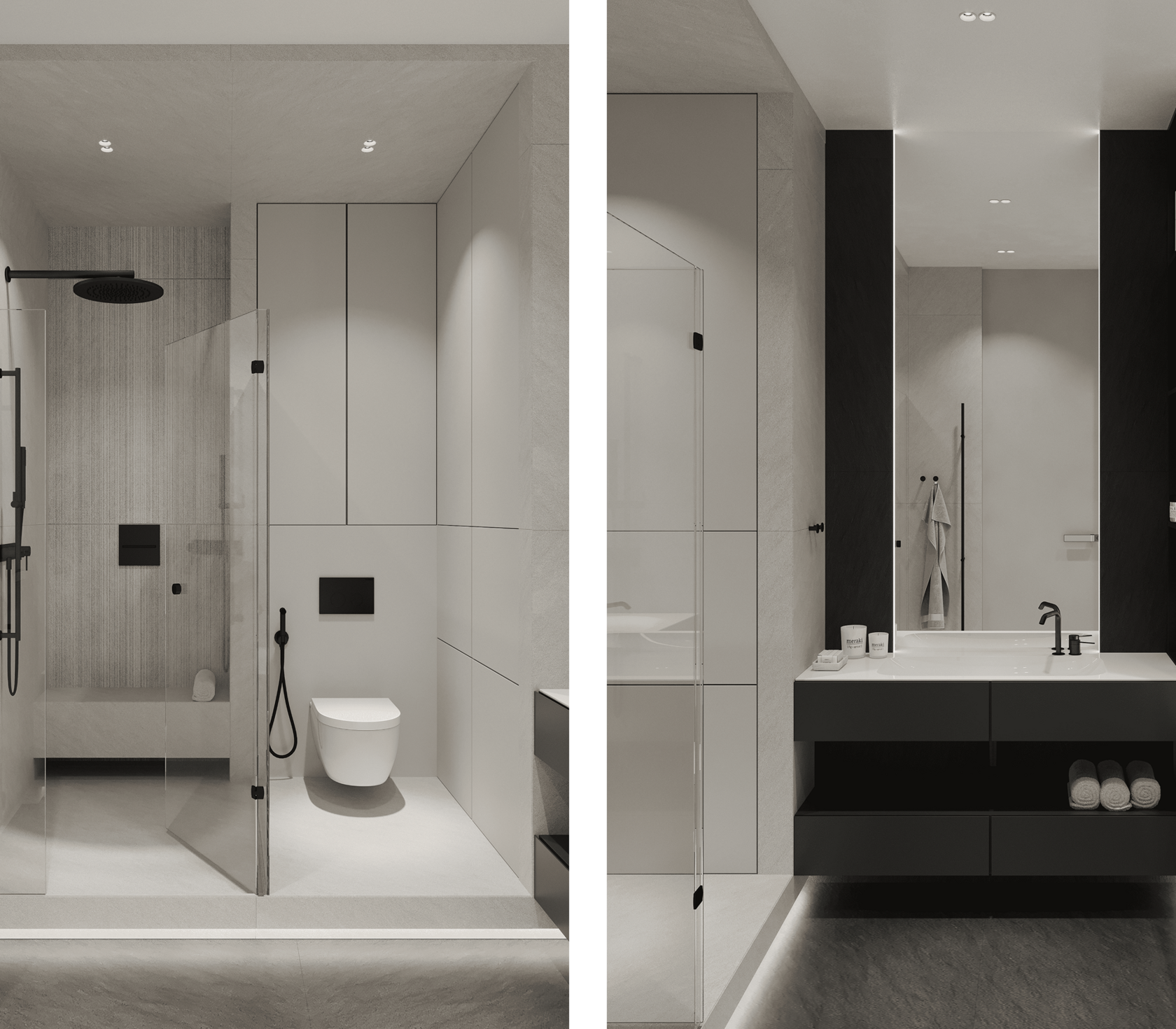 В санузле мы создали атмосферу современного спа-пространства. Зону душевой и унитаза выделили объемом — с подиумом внизу и опуском потолка сверху. Это хорошо видно на визуализациях.