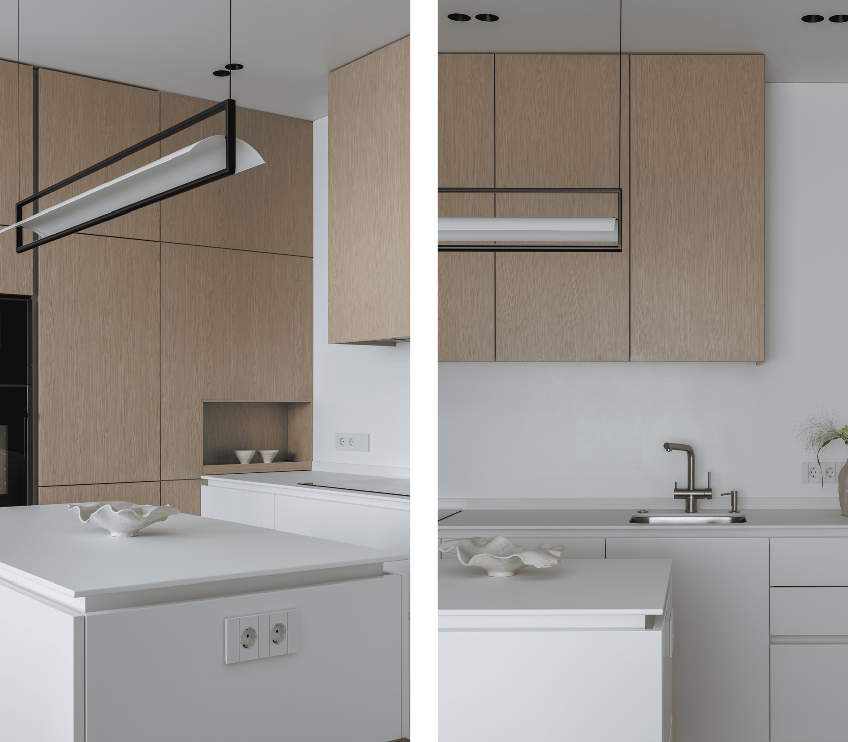 Фасады кухни — это история особого внимания к деталям. Мы специально красили интегрированные ручки в цвет шпона, чтобы добиться идеального визуального единства.