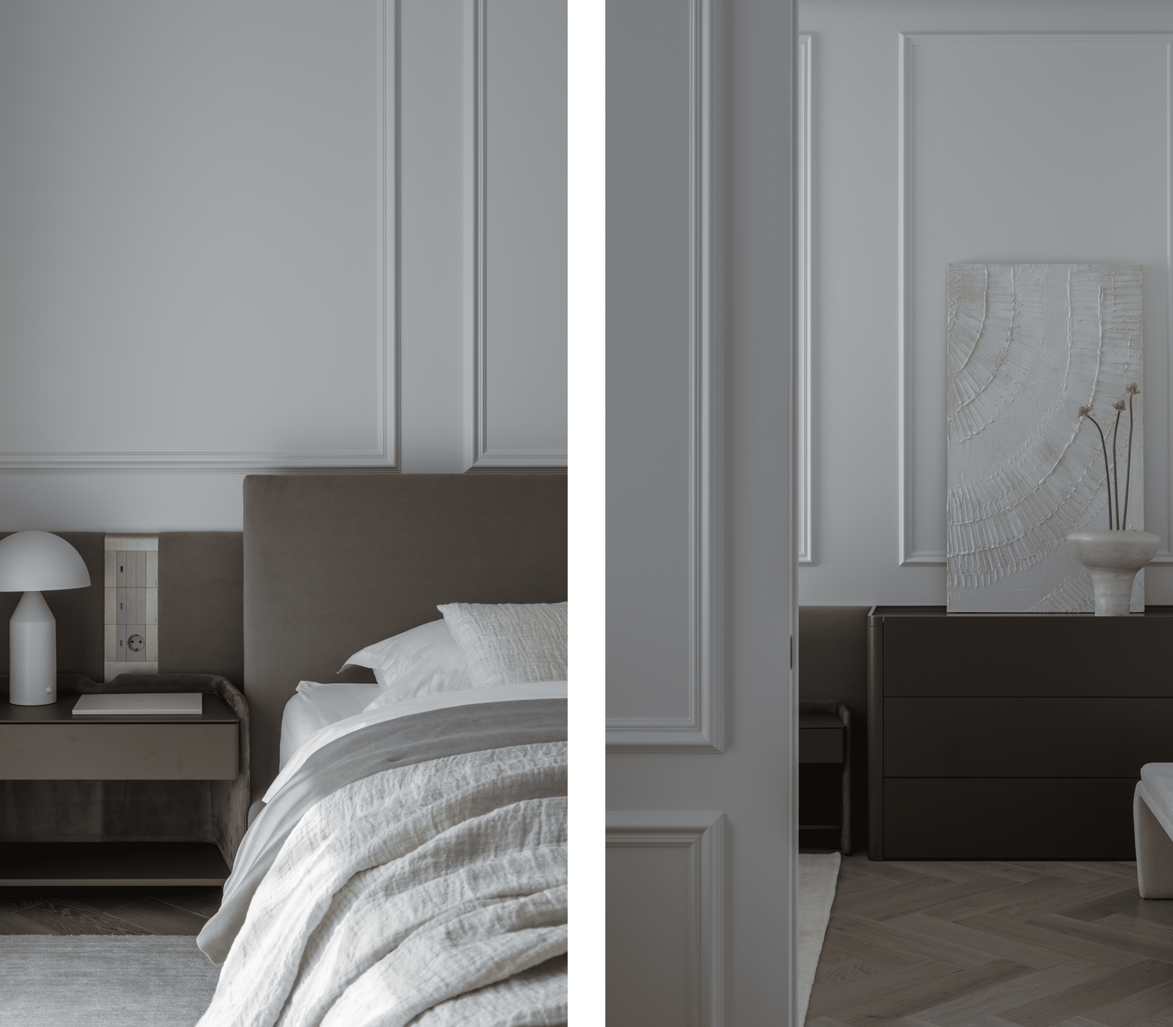 Немного об электрике. Мы хотели превратить прикроватные розетки и выключатели Bticino в предмет современного искусства. Поэтому дополнили стандартные рамки индивидуально изготовленными металлическими плашками сверху и снизу, создав целостную композицию. Особой сложностью стала ювелирная цветоподборка и выкрасы, чтобы точно подобрать оттенок плашек под цвет существующих рамок.