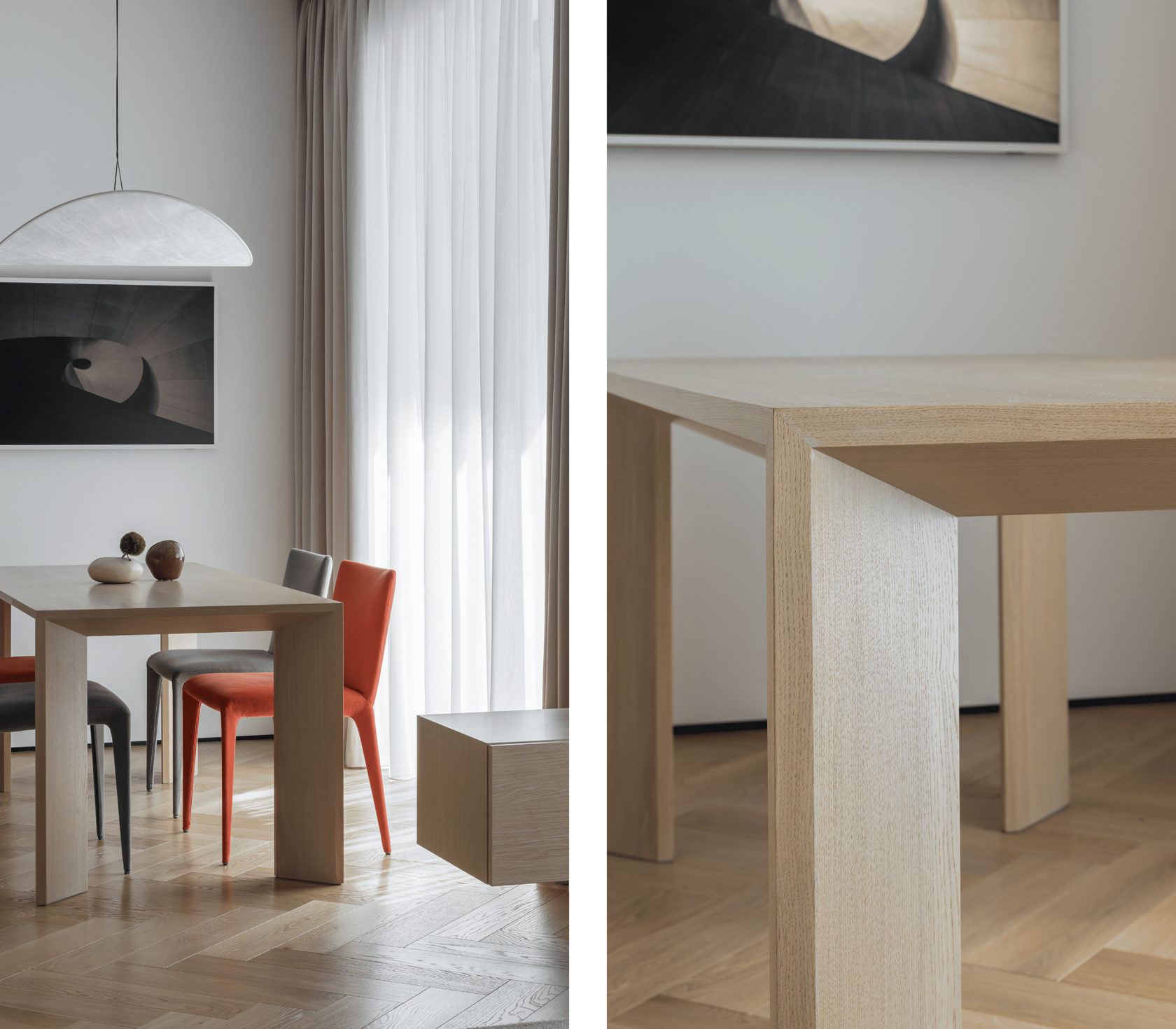Заказчица попросила, чтобы мы подобрали стулья именно со съемными чехлами. Выбор пал на стулья фирмы Bonaldo. Чехлы на липучках легко полностью снять, чтобы постирать или даже поменять, если захочется добавить разнообразия.