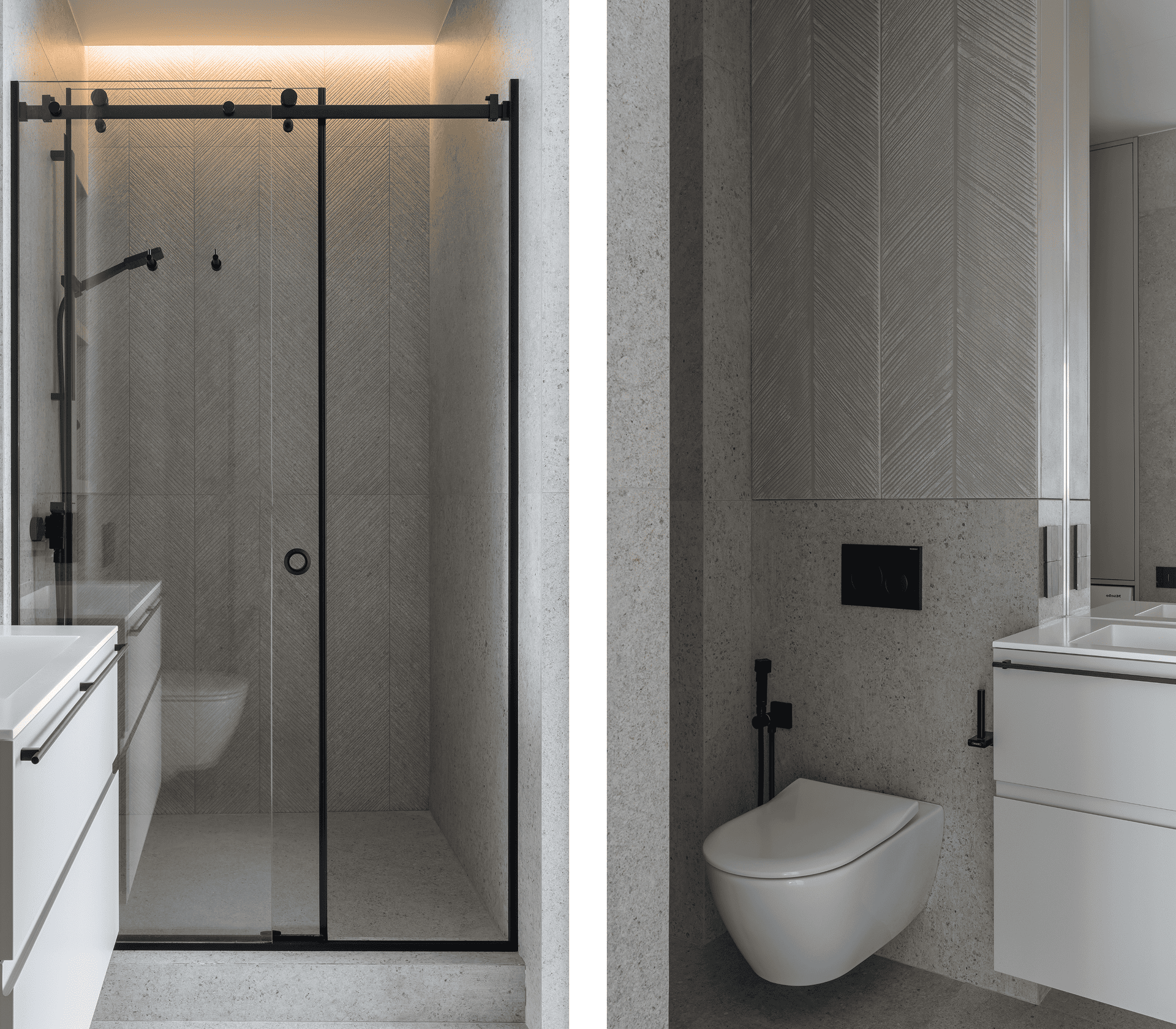 Чтобы избежать визуального шума, в душевой зоне оборудована скрытая ниша, а рядом с унитазом встроена система хранения.