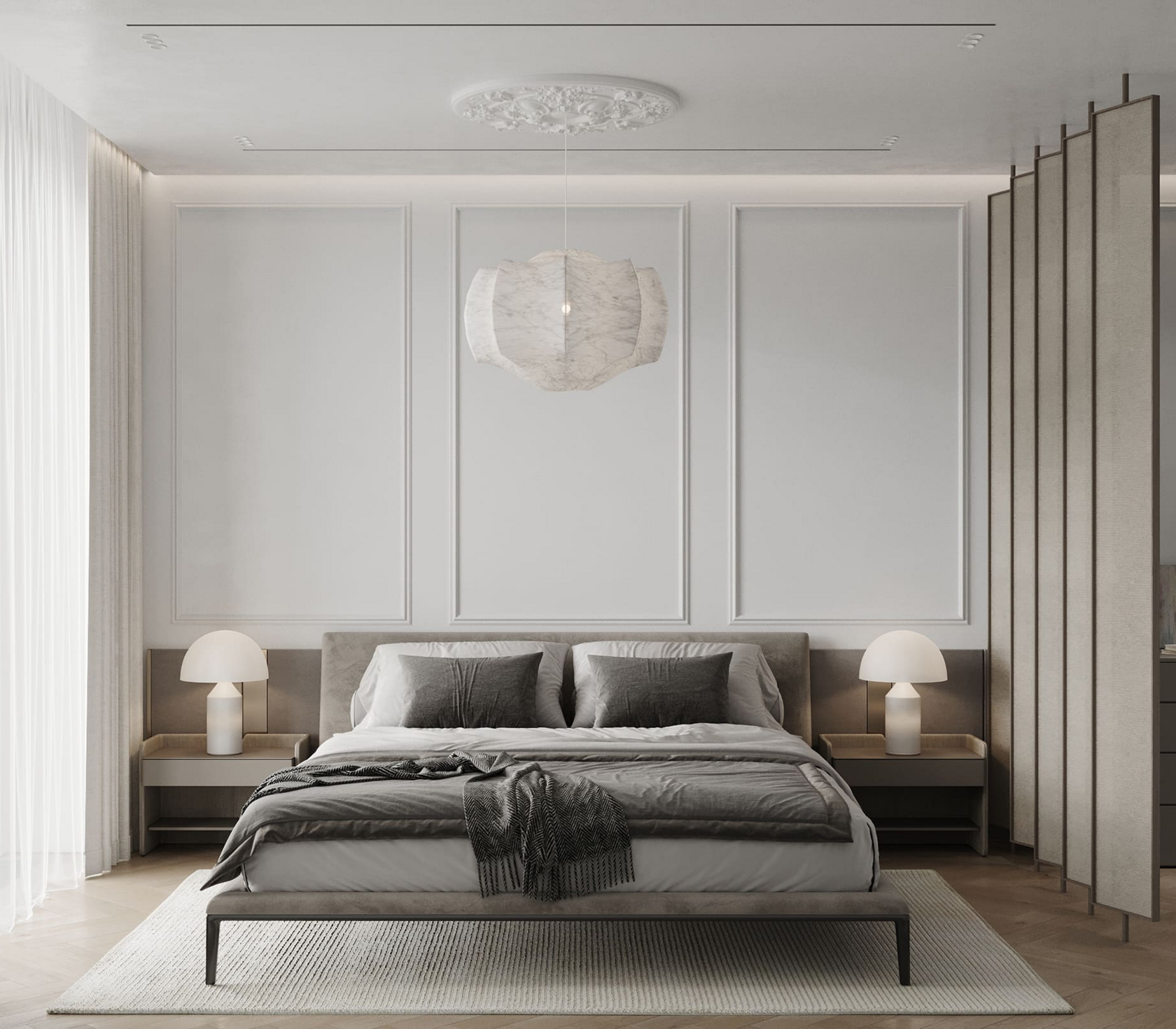 Элегантная минималистичная кровать на высоких ножках — главный герой комнаты.