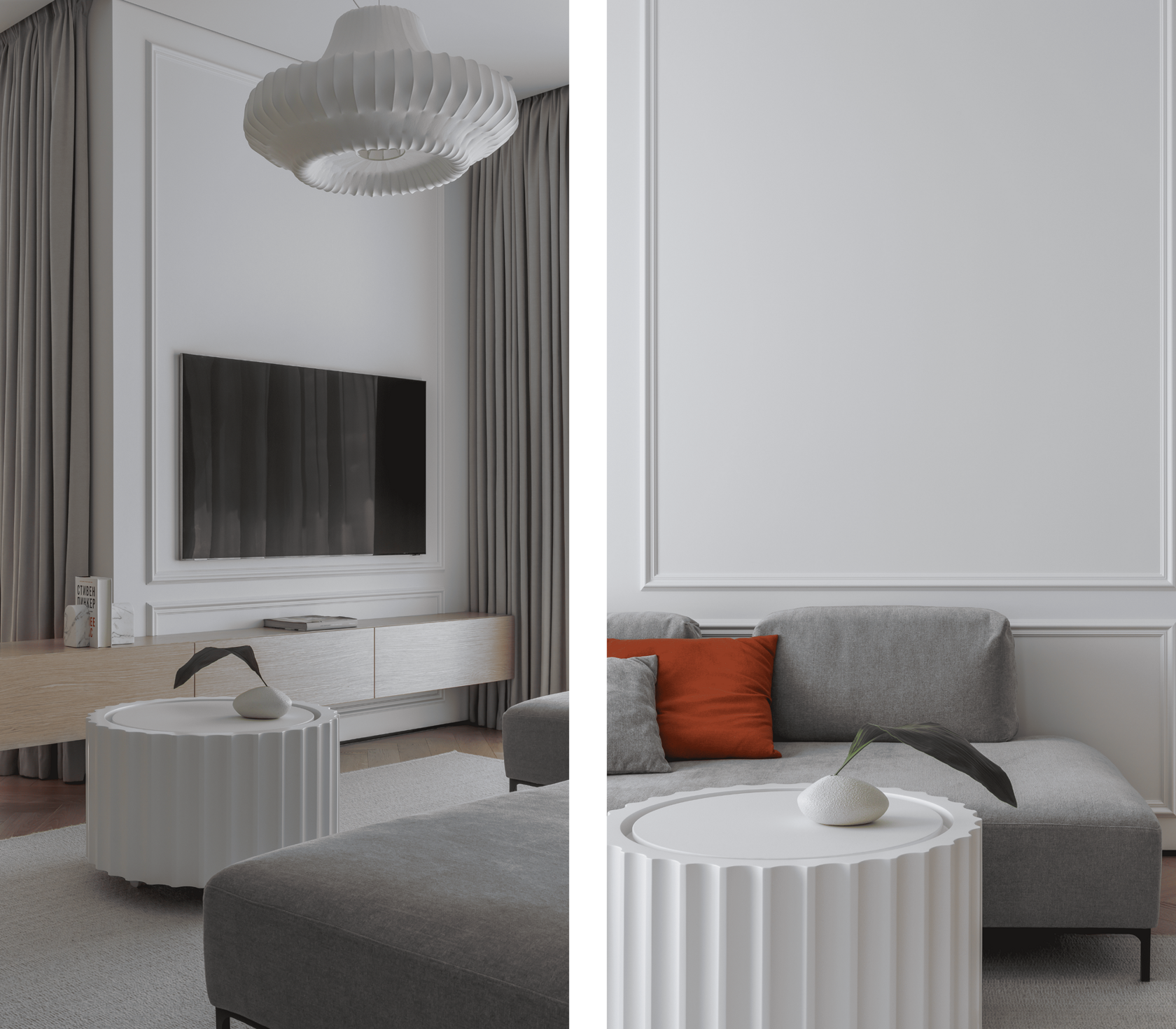 Рядом расположился авторский кофейный столик. Под столешницей скрыто дополнительное место для хранения. Рифленая текстура столика повторяет рисунок люстры, объединяя пространство эстетикой античной колонны.
