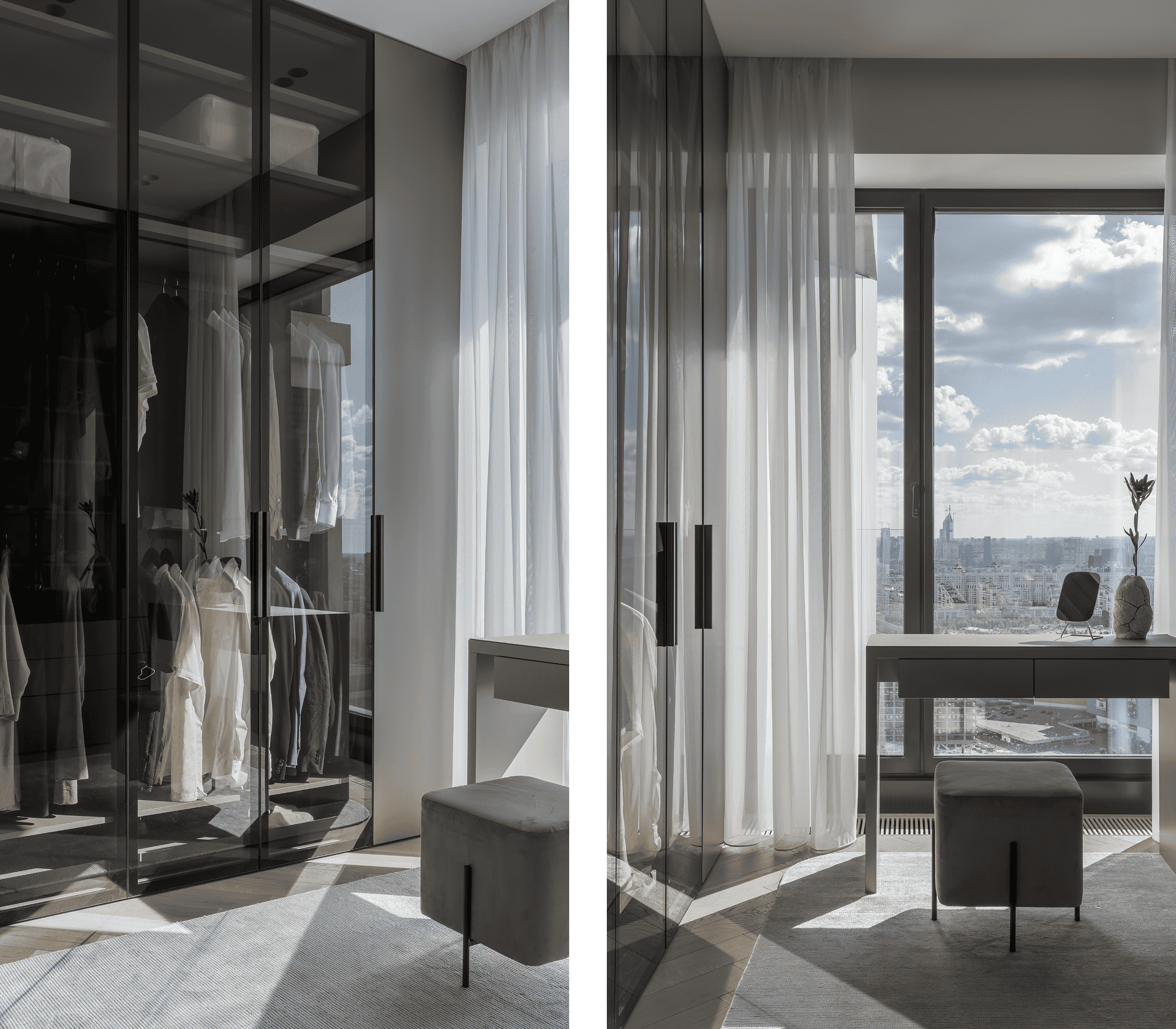 Мы разработали систему хранения, где для каждой вещи есть свое место. Главной сложностью и одновременно победой стали высокие, трехметровые фасады до потолка со скрытыми петлями. Найти поставщика, готового выполнить такую работу, было непросто.