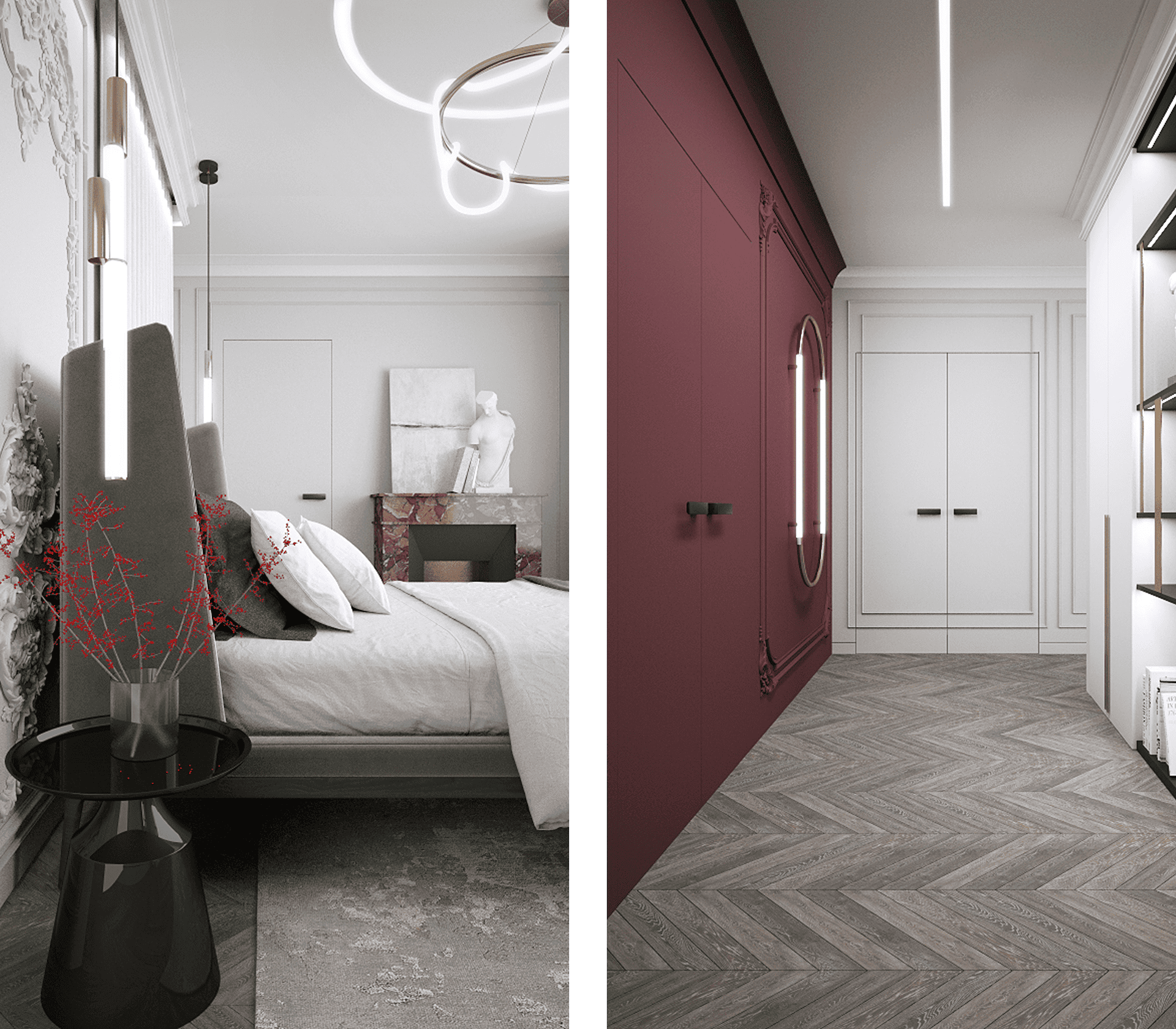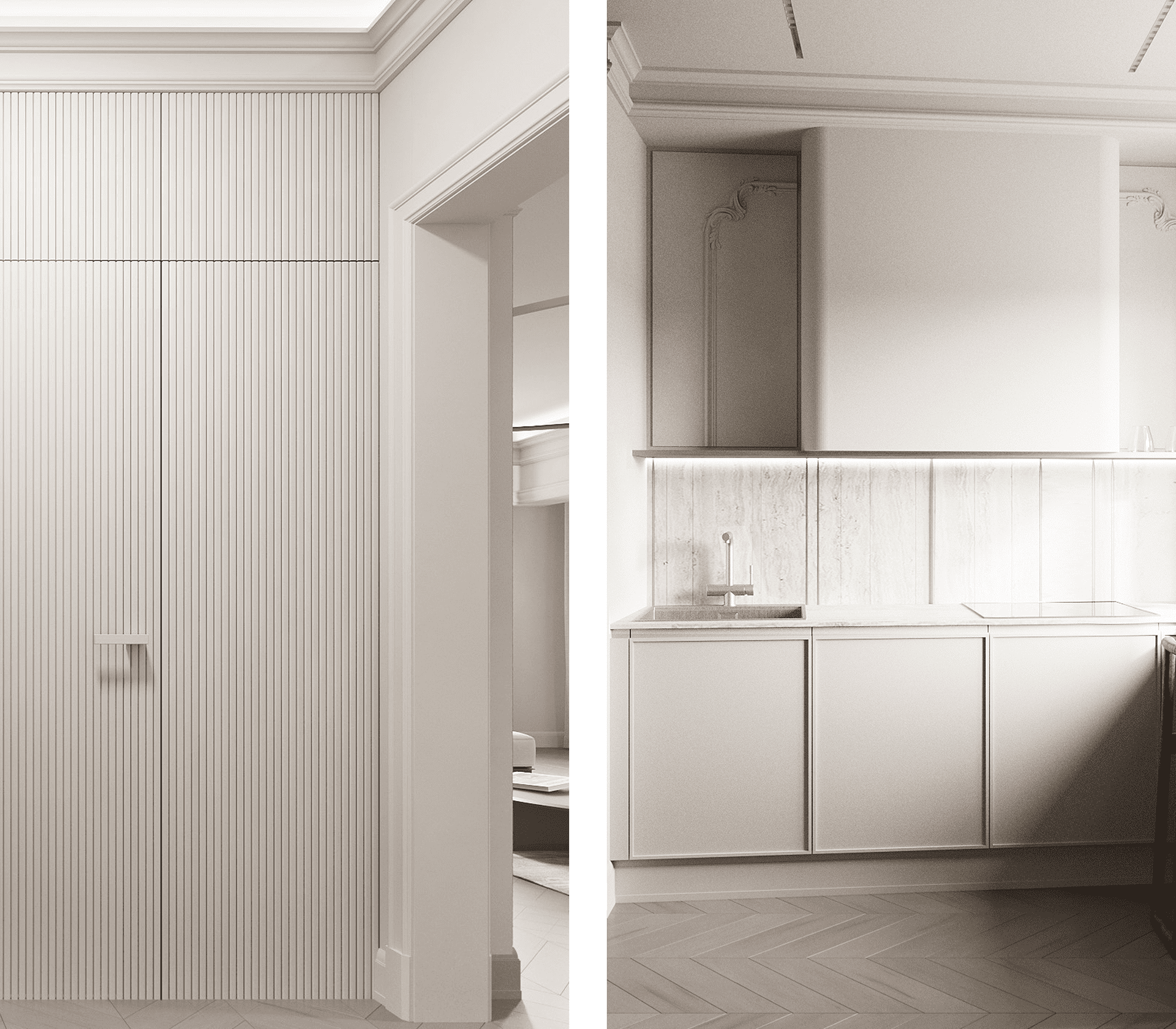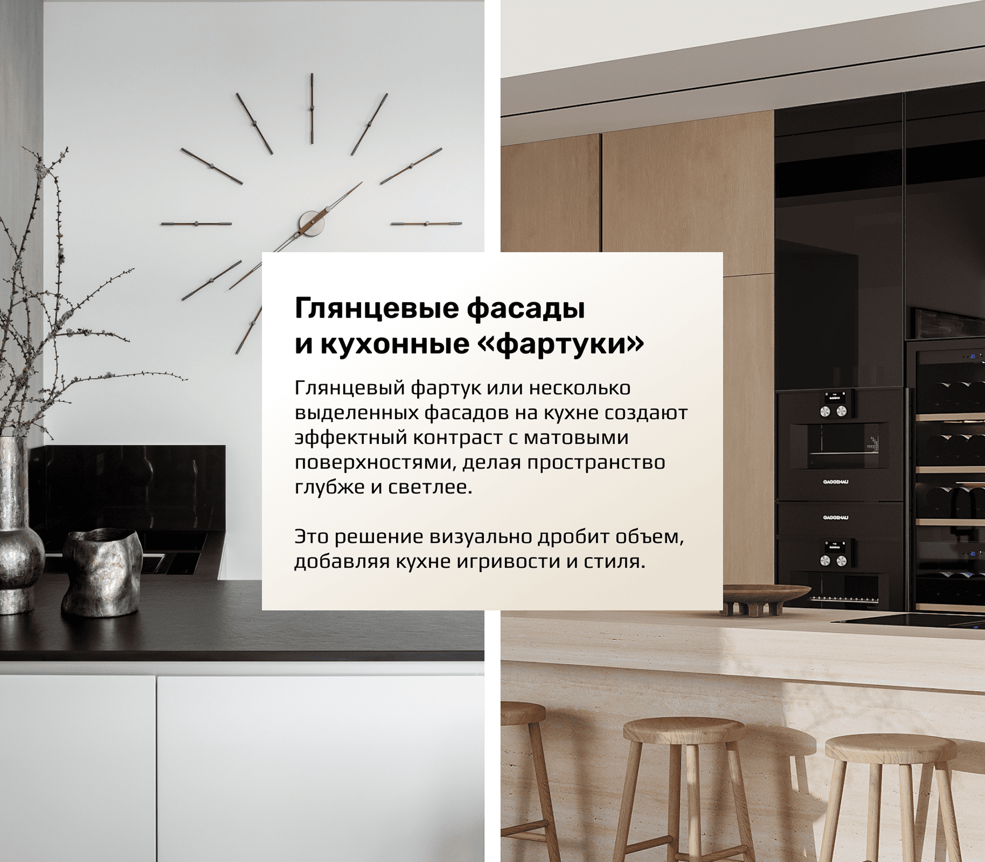 Акцент создается не глянцем, а сложным рельефом. При этом мы не отказываемся от глянца совсем. Фасады со стеклом, зеркальные вставки в гардеробных или металлические элементы становятся яркими акцентами, которые выглядят уместно и стильно, а не создают лишнего блеска.