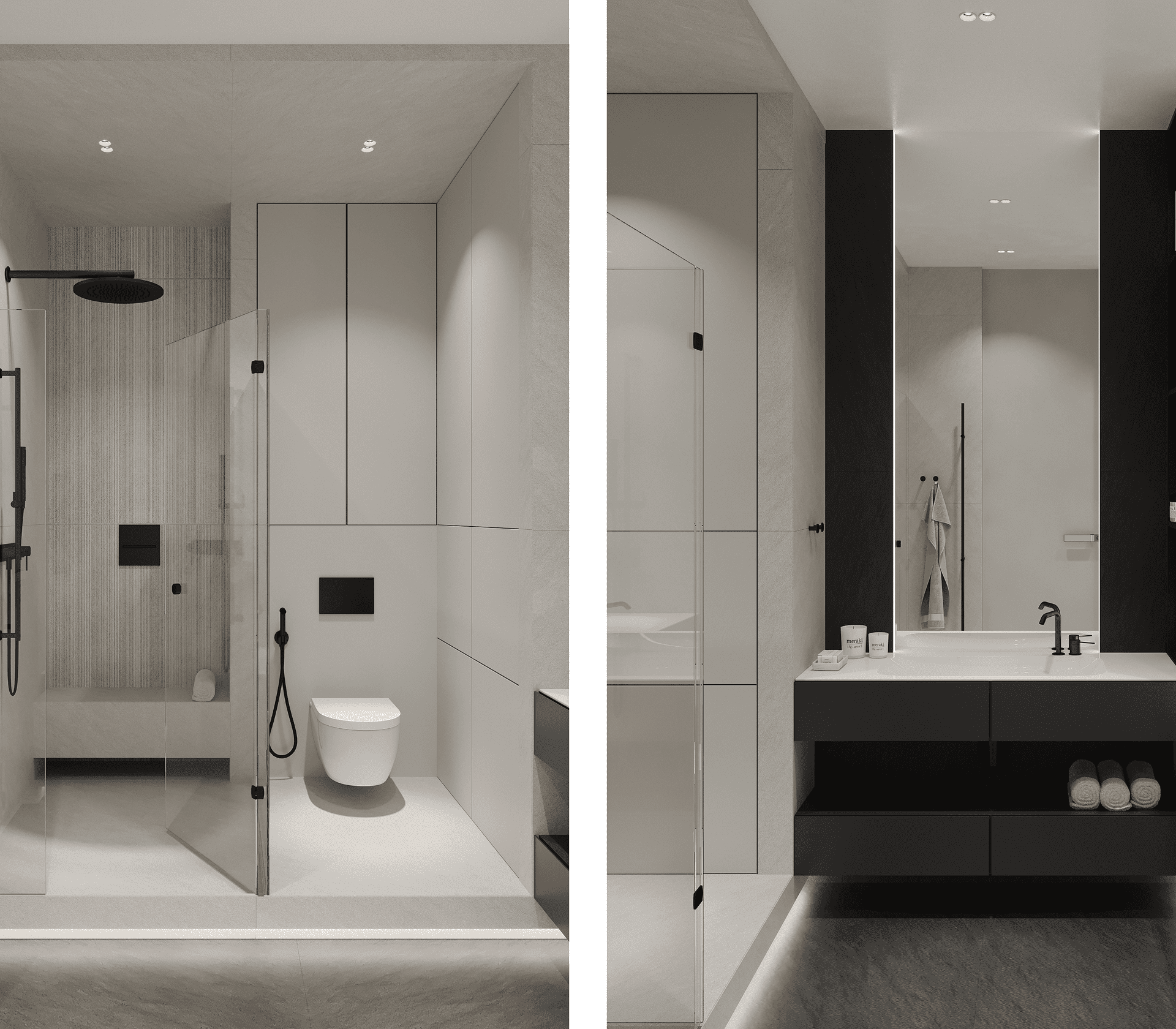 В проекте Ж К Прайм Парк в санузле мы полностью отделали керамогранитом зону душа и туалета. Также выделили подиумом внизу и опуском потолка сверху. Получилось интересное капсульное пространство.