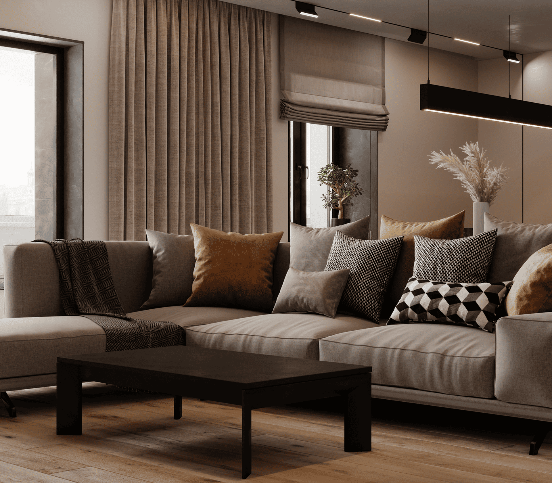 Обивка мебели, шторы, пледы и подушки без блеска визуально теплые, тактильно приятные и идеально вписываются в концепцию уютного интерьера.