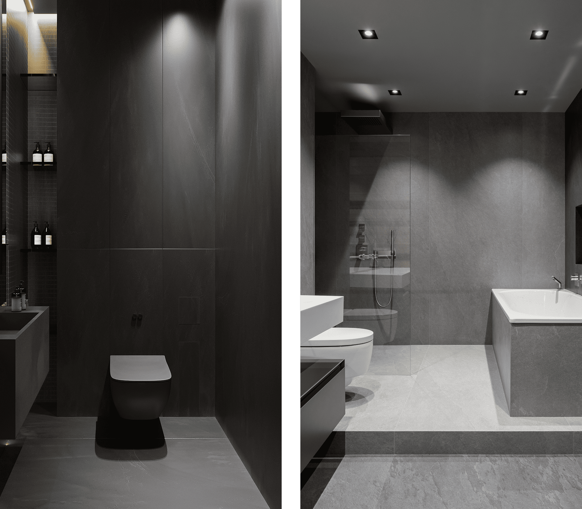 Для влажных зон, таких как санузел, мы иногда применяем в отделке керамогранитные слэбы. Это более редкое явление, из-за непростого монтажа, но очень практичное и стильное.