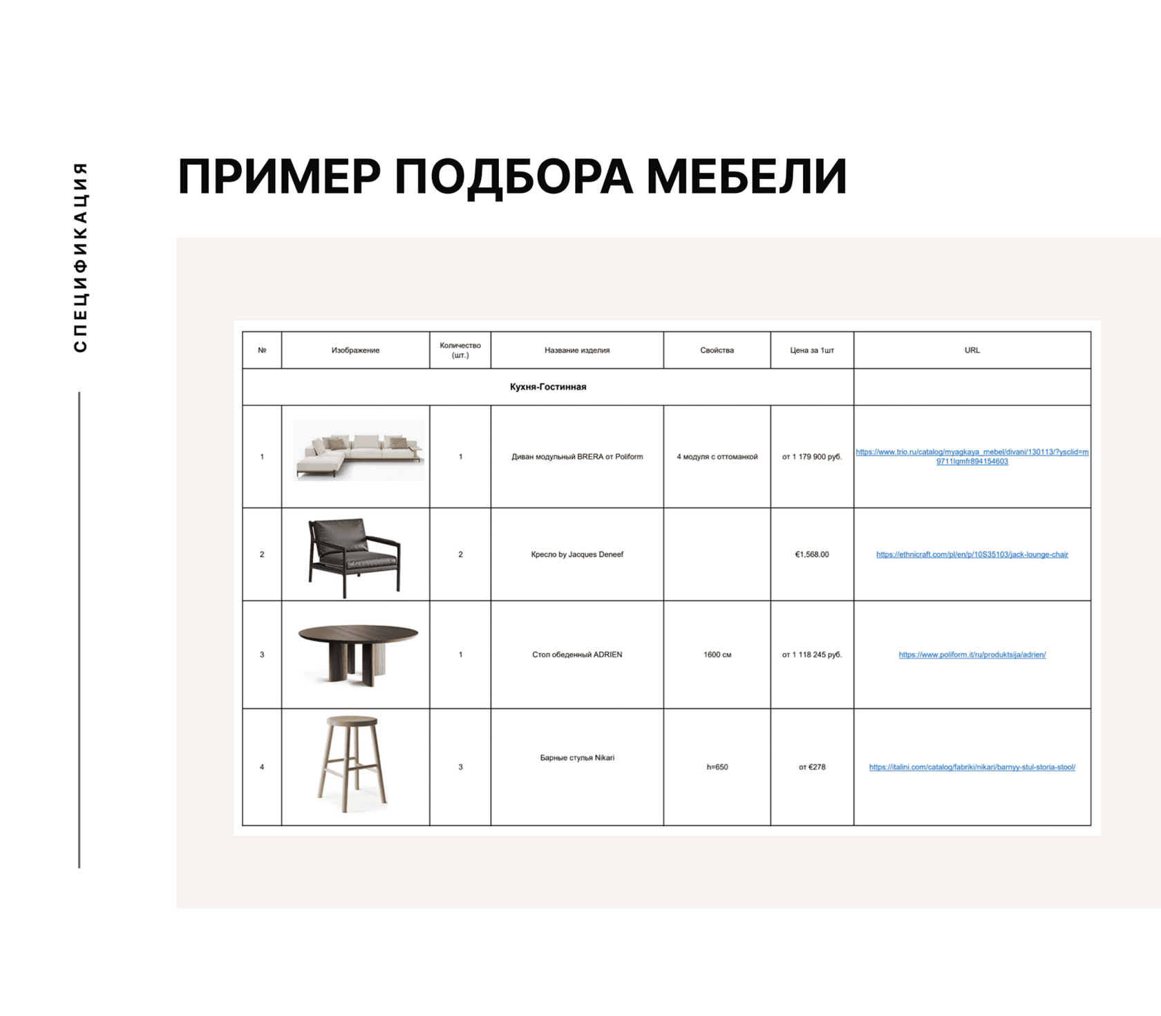 Таблица подбора мебели и материалов