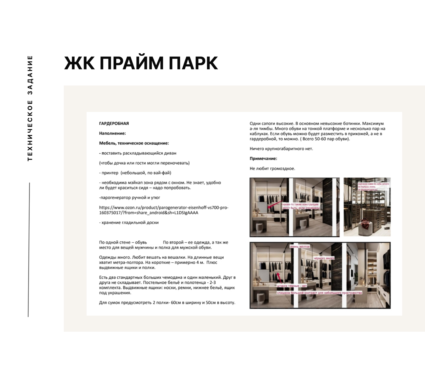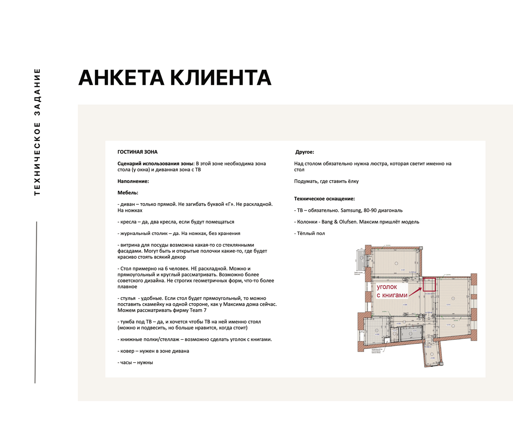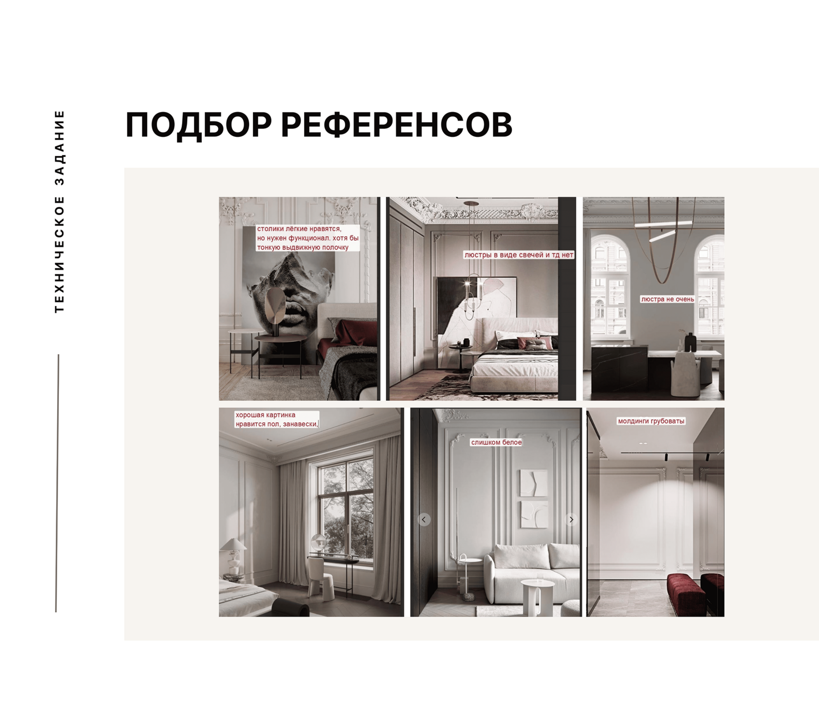В нем фиксируем согласованные визуальные референсы, общие стилевые предпочтения и сценарии жизни. Здесь фиксируются важные детали, например, в гостиной нужны часы и журнальный столик без хранения, а еще место для новогодней елки.